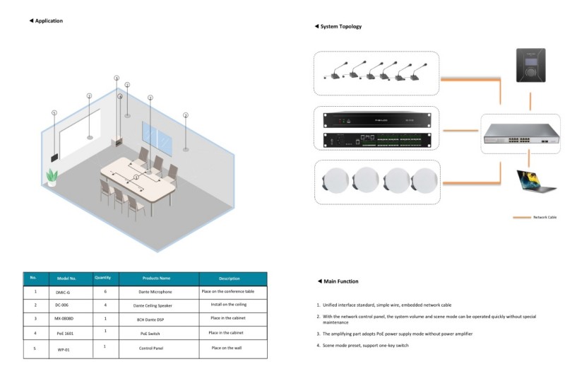 o Інтэграцыя блока харчавання POE: супрацоўнічаць з POE Switches, каб рэалізаваць аднакаблічны блок харчавання + перадача дадзеных мікрафонаў/дынамікаў Dante (напрыклад, серыі Shure MXA).
